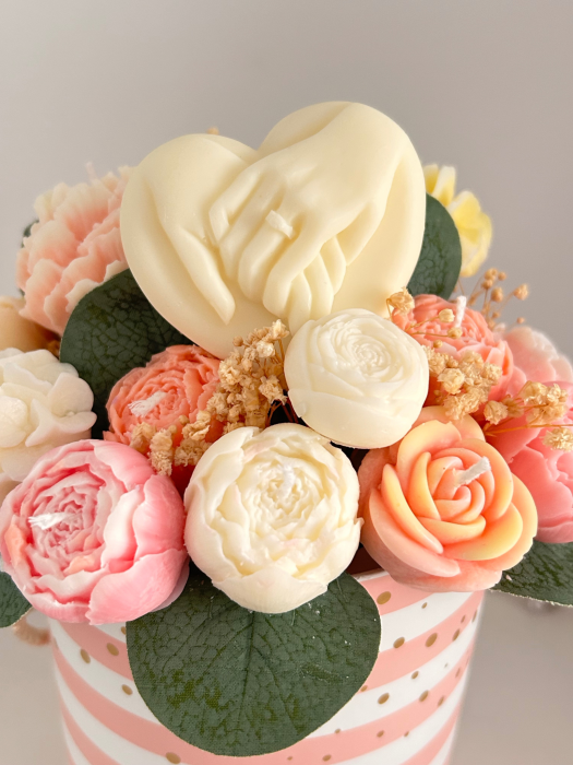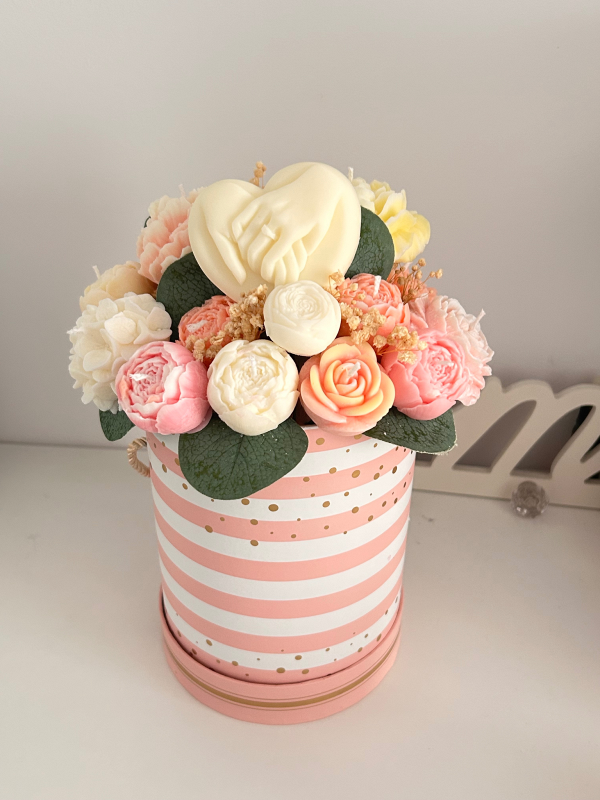 Un buchet elegant, realizat manual din flori de ceara parfumata in nuante delicate de roz, alb si galben, asezat intr-o cutie decorativa cu dungi fine si accente aurii. Elementul central este inima cu doua maini impreunate, simbol al iubirii si al promisiunilor, care ofera aranjamentului un aer romantic si rafinat. Perfect ca decor pentru casa, dar si ca dar deosebit pentru nunta, logodna sau aniversare.