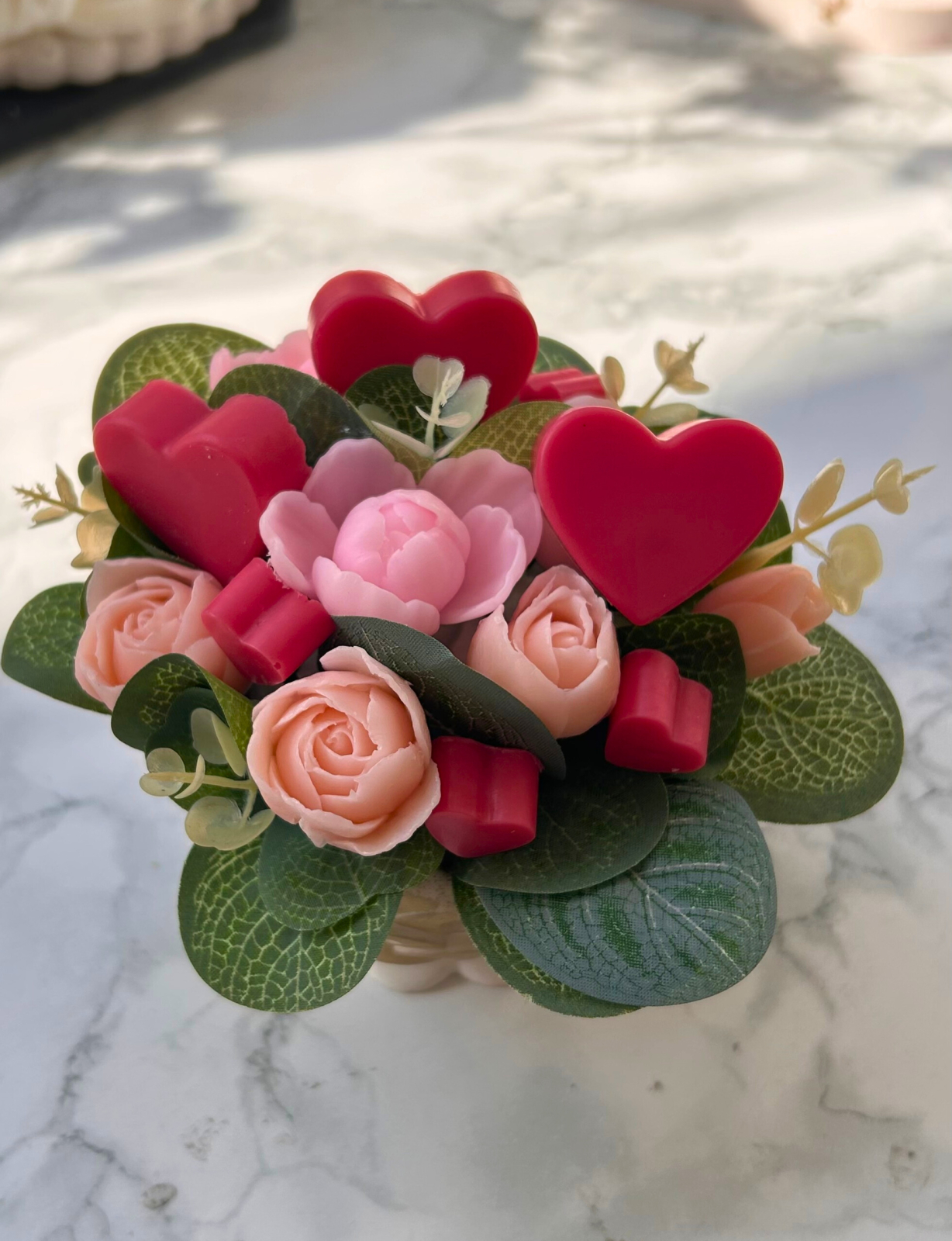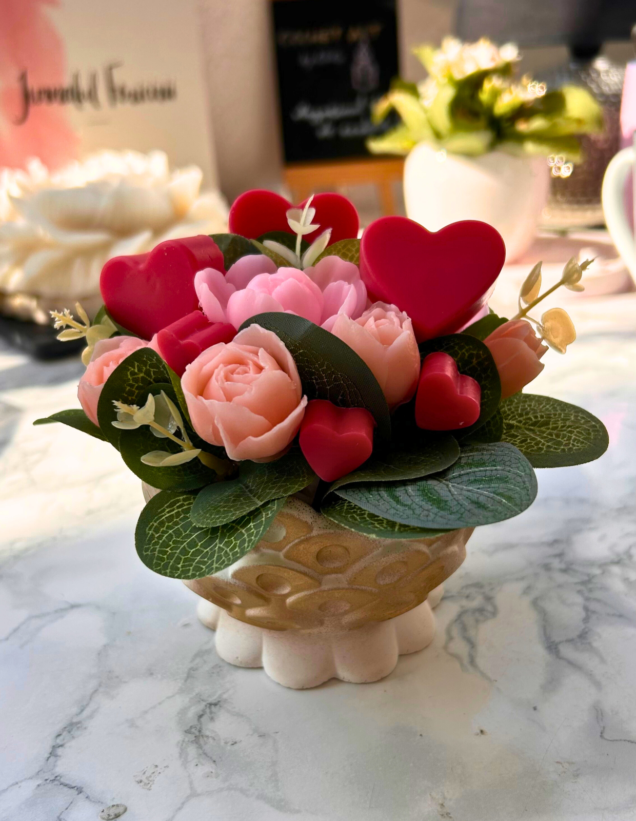 Aranjament micut dar cu un impact foarte mare realizat din praf ceramic si vopsit in nunate de auriu si cu flori din sapun frumos colorate, iar piesa principala reprezentand-o ininioarele din sapun ce ofera un aer romantic.