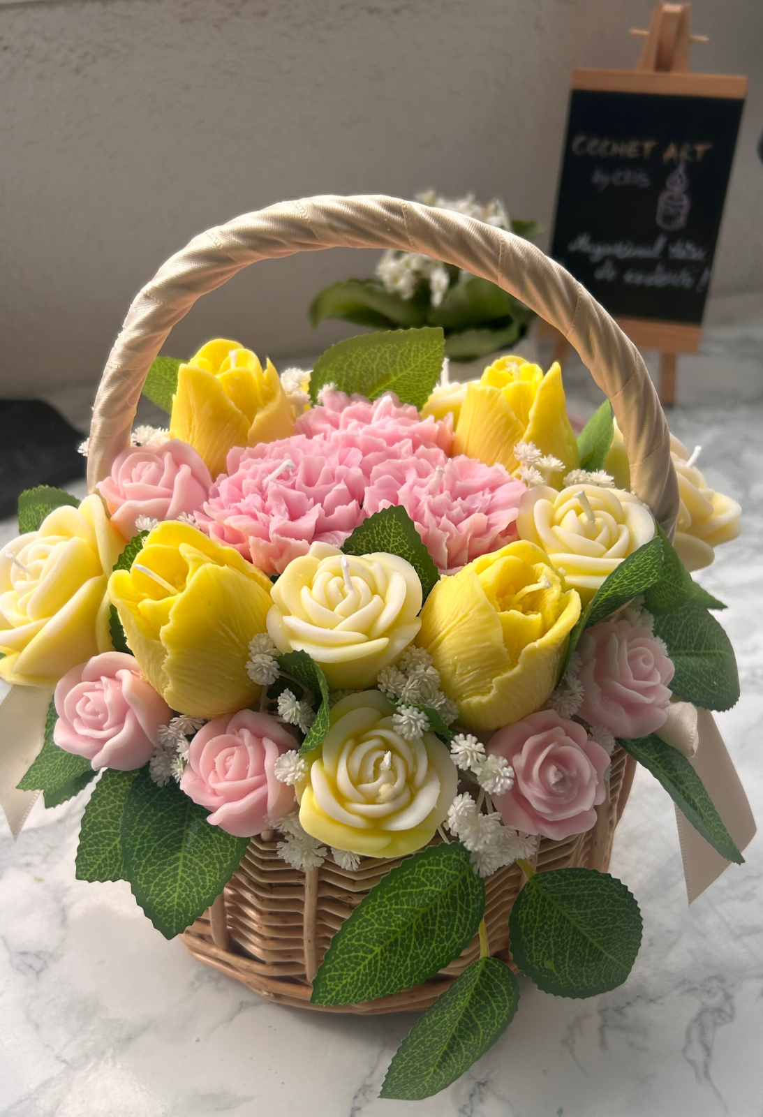 Cos cu flori din ceara naturala de soia cu un parfum deosebit de flori care poate fi personalizat dupa placul tau pentru a-ti infrumuseta casa sau pentru a fi daruit unei persoane dragi.