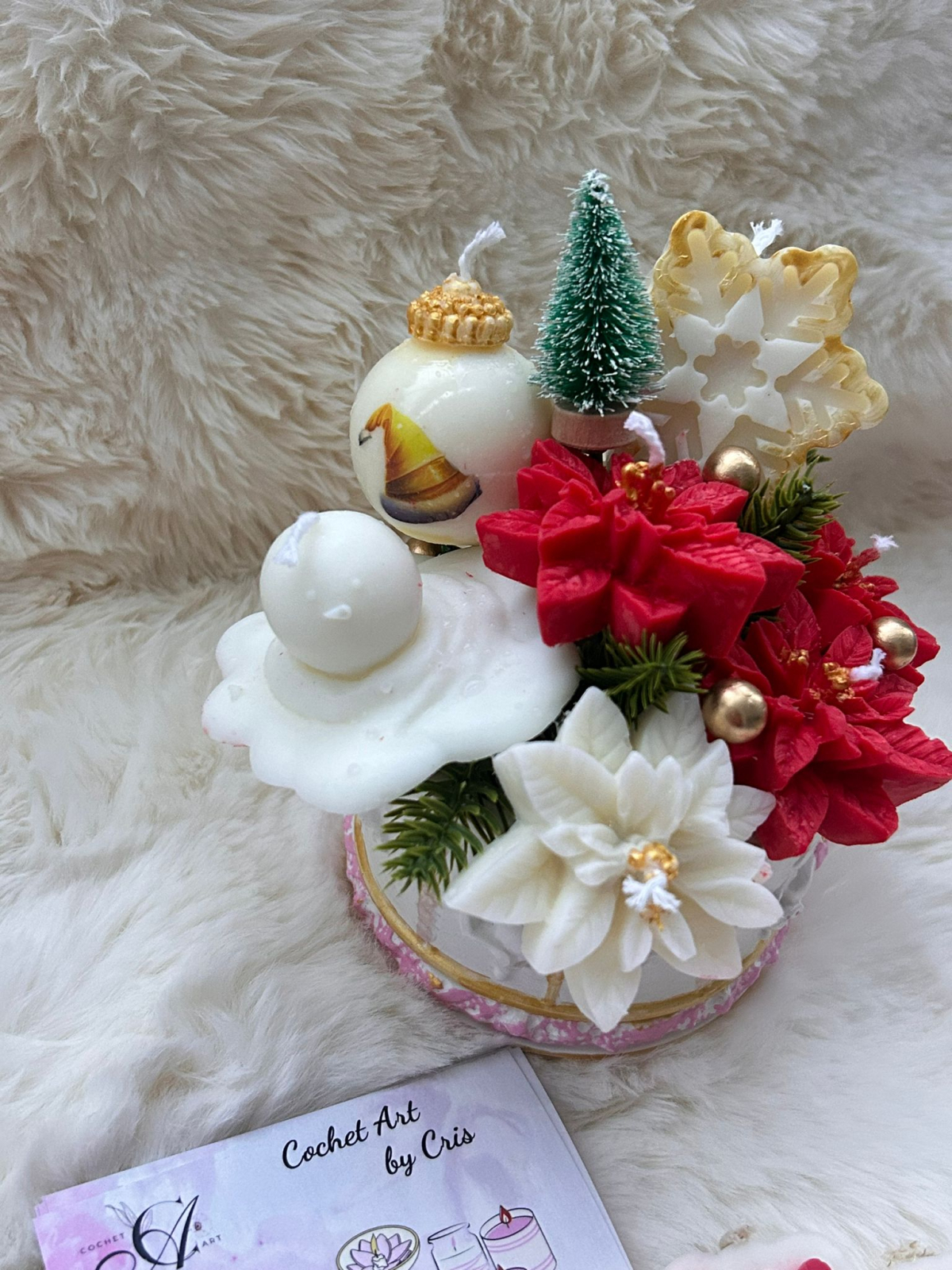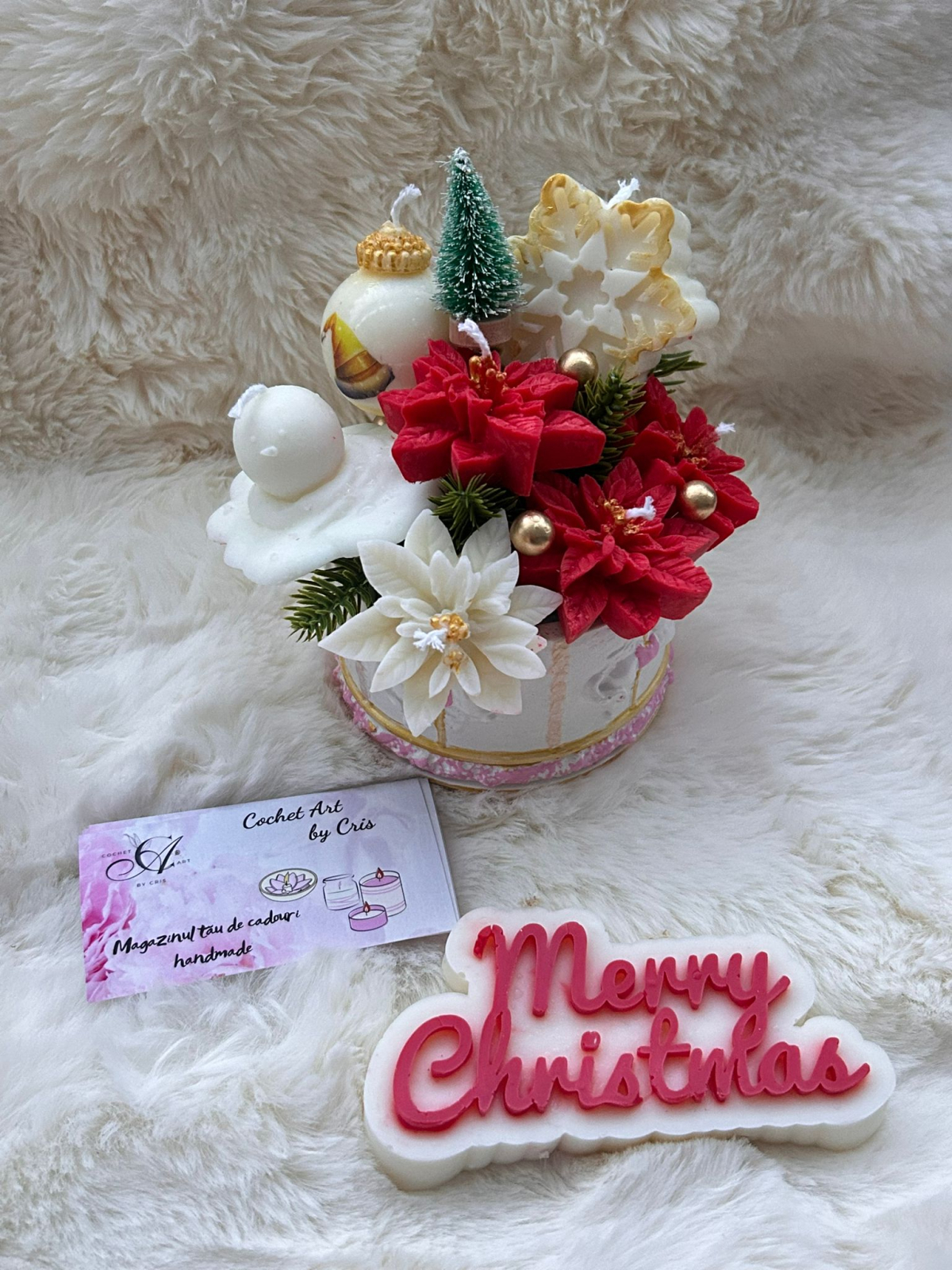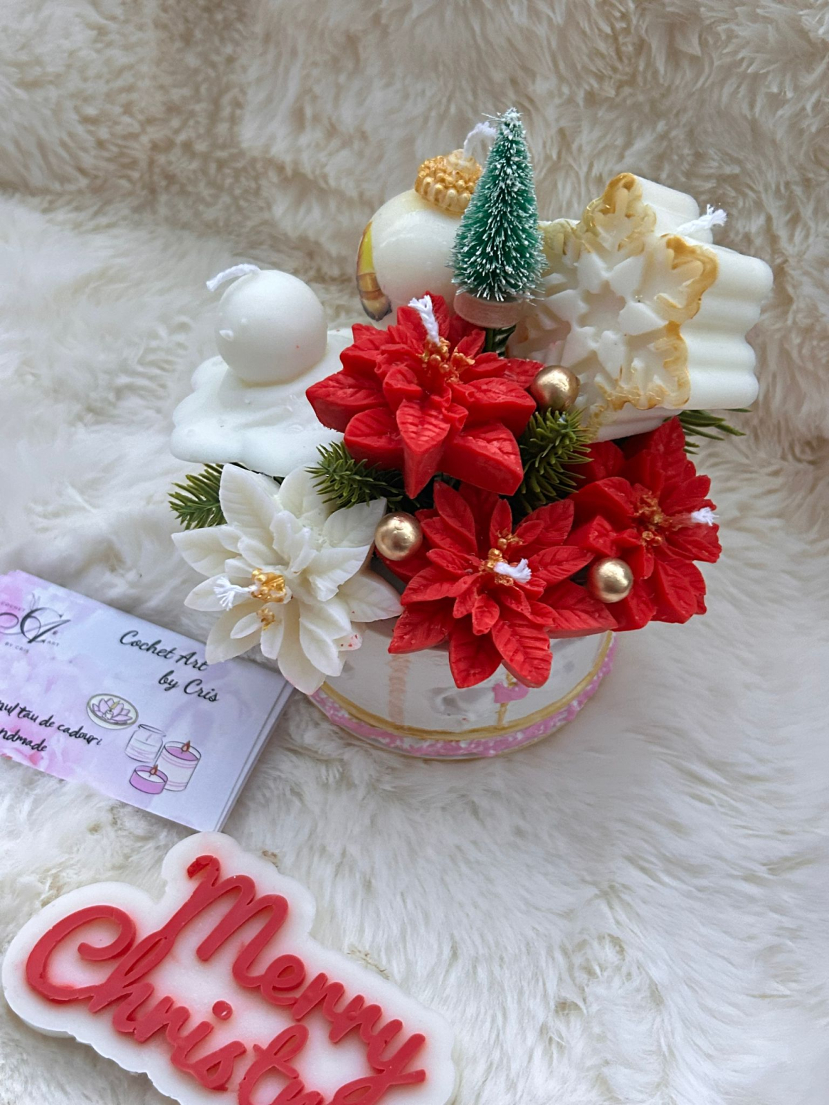 Aranjament realizat din Craciunite, un fulg, un globulet si un omulet de zapada din ceara de soia, toate aranjate intr-un recipient carusel realizat din praf ceramic pictat manual.