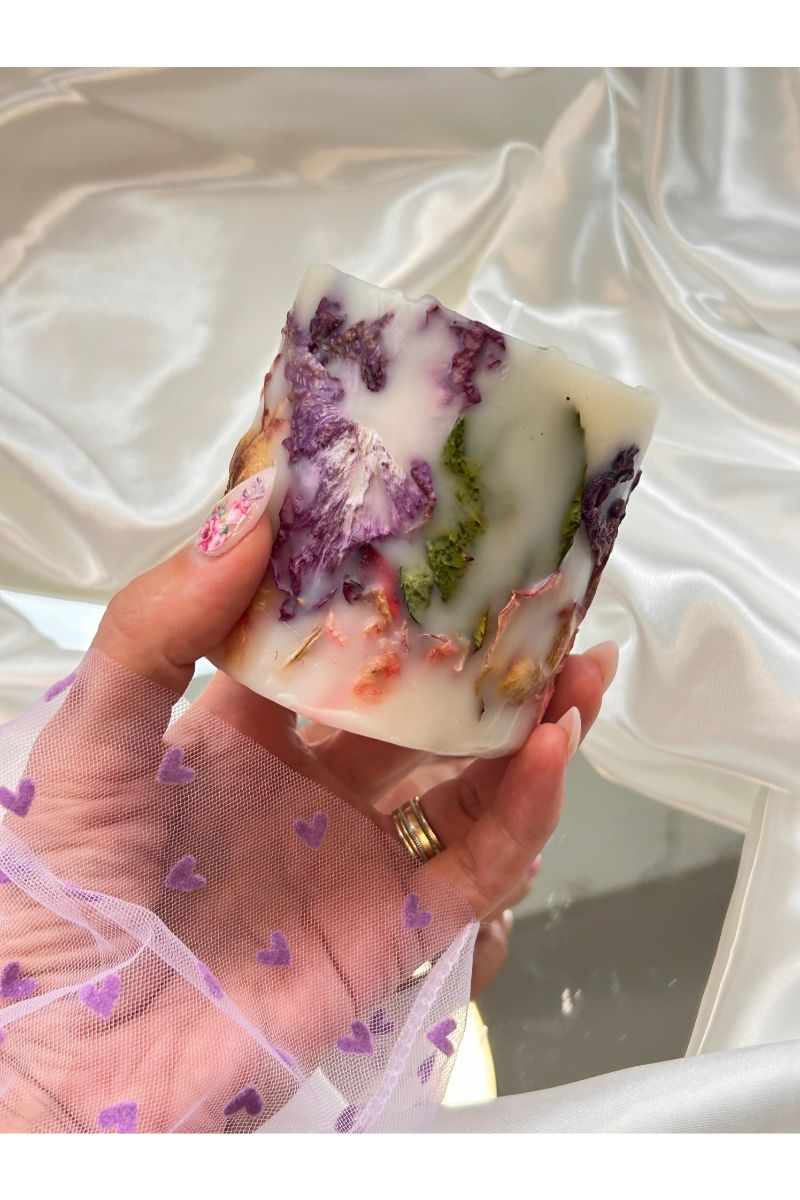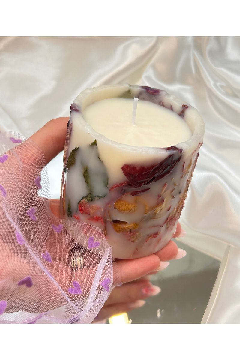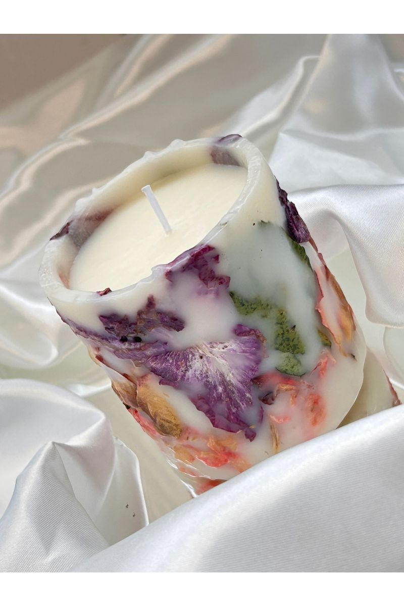 Aceasta lumanare realizata manual imbina frumusetea naturala a florilor si frunzelor uscate cu delicatetea cerii albe. Fiecare piesa este unica, cu insertii vegetale ce creeaza un design aparte, aducand un strop de natura si armonie in decorul casei tale.