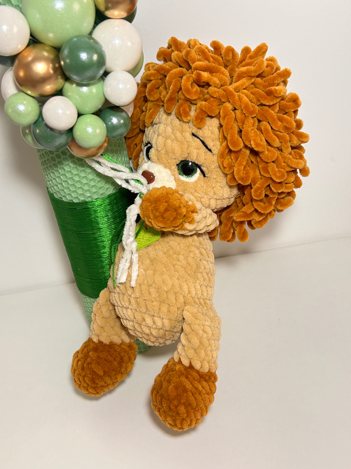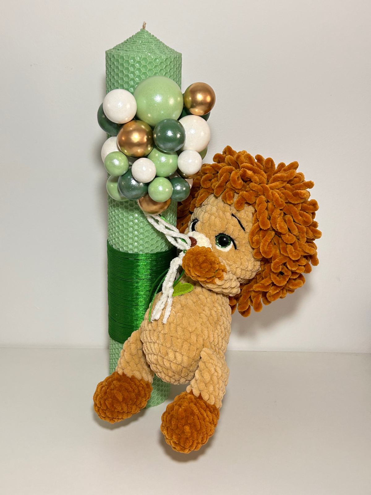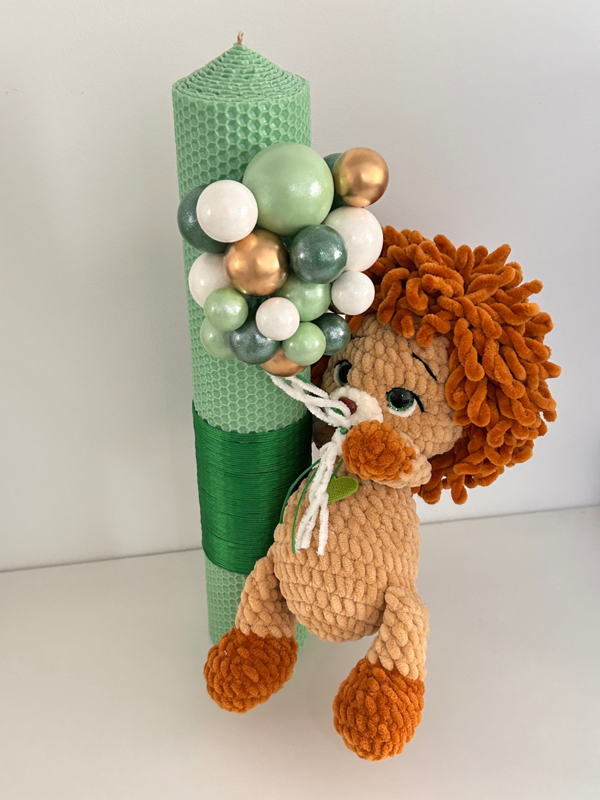 Realizata din ceara naturala de albine, cu un delicat model fagure si miros deosebit, aceasta lumanare de botez este decorata manual cu un leut crosetat cu dragoste ce poate deveni jucatia preferata a micutului botezat si baloane colorate din polistiren, simbolizand puritatea si bucuria inceputului de drum. Fiecare detaliu este lucrat cu grija, oferind o nota unica si personala ceremoniei speciale.