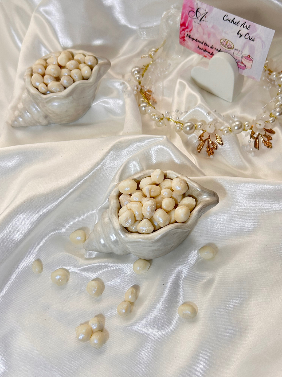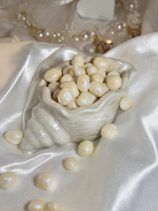 Transforma orice colt al casei intr-un refugiu elegant cu aceasta lumanare artizanala sub forma de scoica, plina cu perle din ceara fina, stralucitoare. Fiecare „perla” este realizata manual si asezata cu grija intr-un recipient ceramic in forma de cochilie, evocand frumusetea marii si rafinamentul natural.