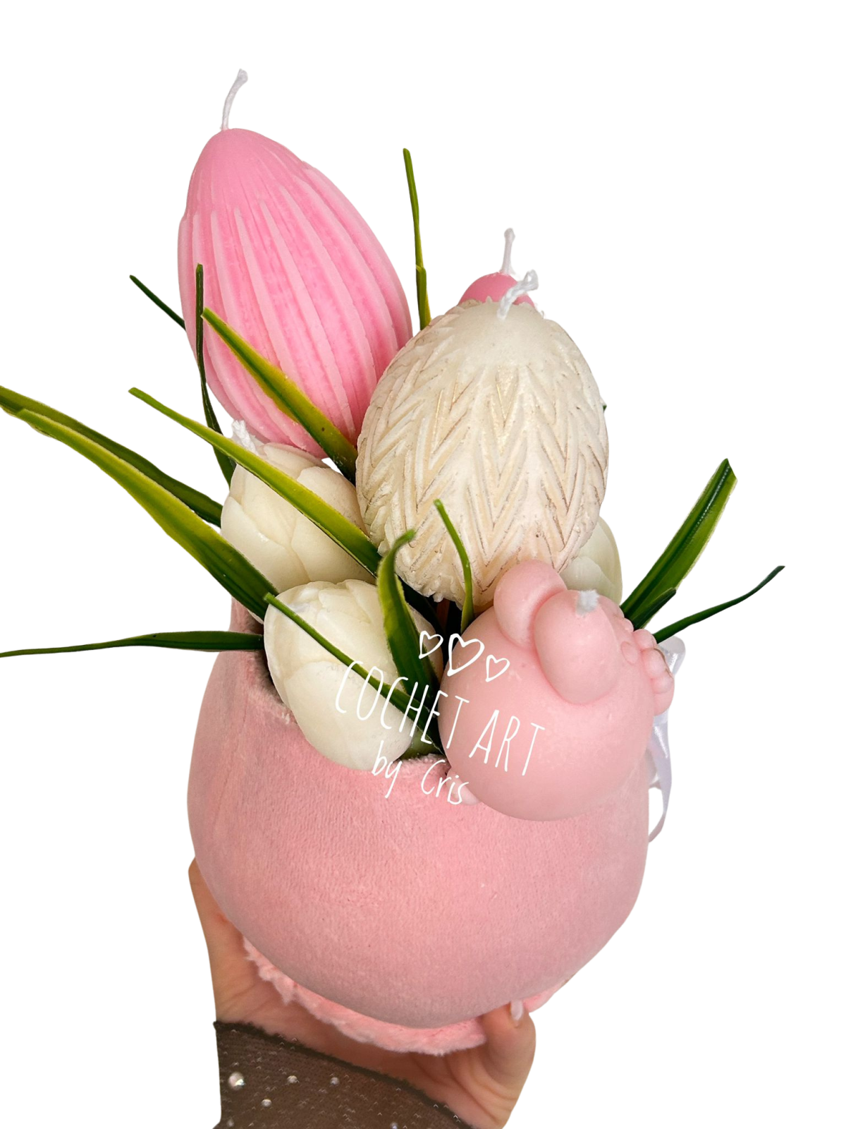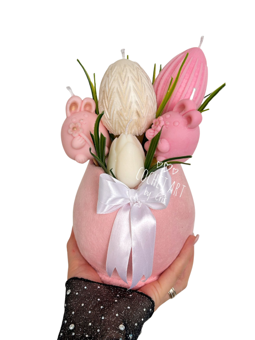Un aranjament superb in cutie din catifea in forma de ou spart cu lumanari din ceara de soia in forma de oua si flori. Aranjamentul infrumuseteaza orice incapere si este perfect pentru masa de Paste. Aceste lumanari au diferite parfumuri de flori, vanilie, scortisoara.