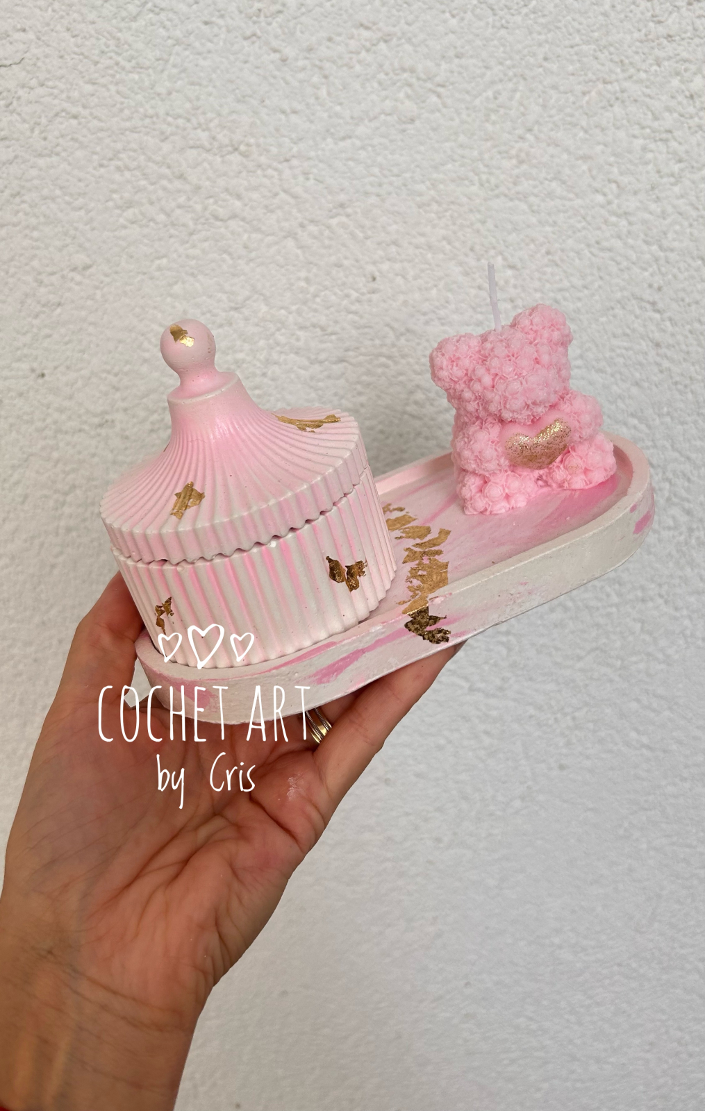 Set elegant in nuante de roz format dintr-o tavita realizata din praf ceramic si o bomboniera cu capac tot din praf ceramic ce va impresiona cu siguranta invitatii.
