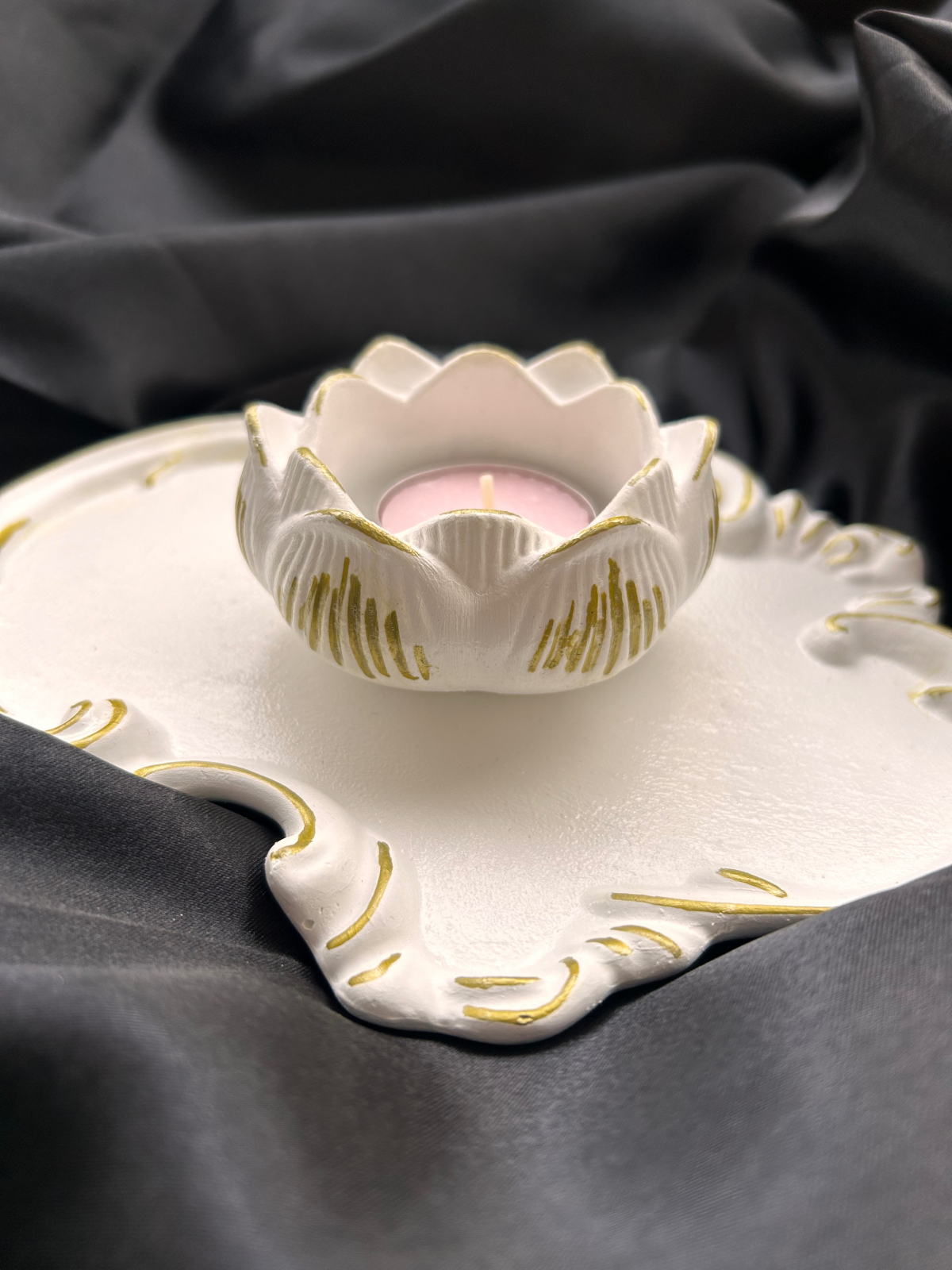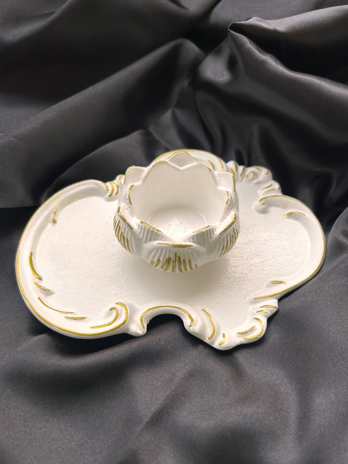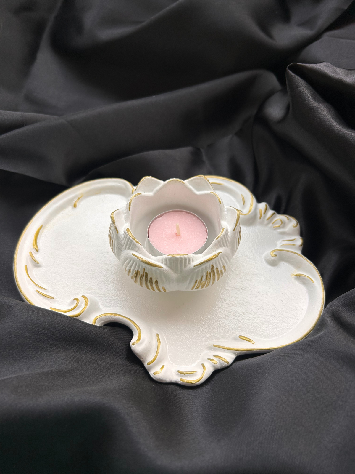 Set realizat manual din ceramica, format dintr-un recipient elegant in forma de floare si o tavita cu detalii aurii. Designul delicat si nuantele calde de alb si auriu adauga o nota rafinata oricarui decor. Perfect ca suport pentru lumanari pastila, bijuterii sau alte accesorii mici.